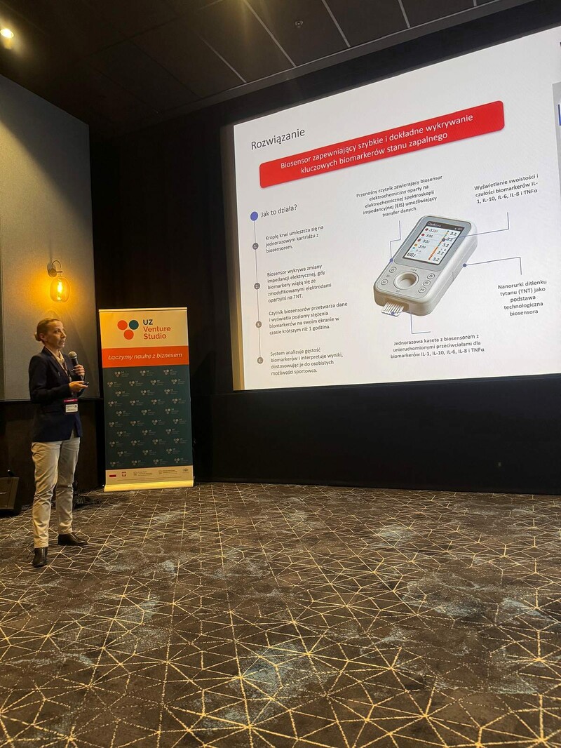 - Dr hab. inż. Katarzyna Arkusz, prof. UZ zaprezentowała rozwiązanie opracowane w ramach projektu EIT Health – „NIBITIC” (biosensor do oznaczania cytokin prozapalnych) – dedykowane dla medycyny sportu: monitorowanie stanów zapalnych, lepsze zarządzanie regeneracją i optymalizacja wyników.